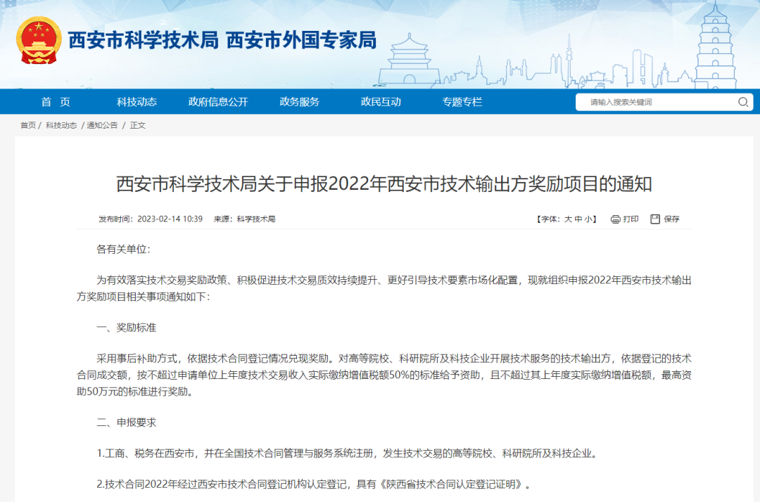 西安市科学技术局丨关于申报2022年西安市技术输出方奖励项目的通知