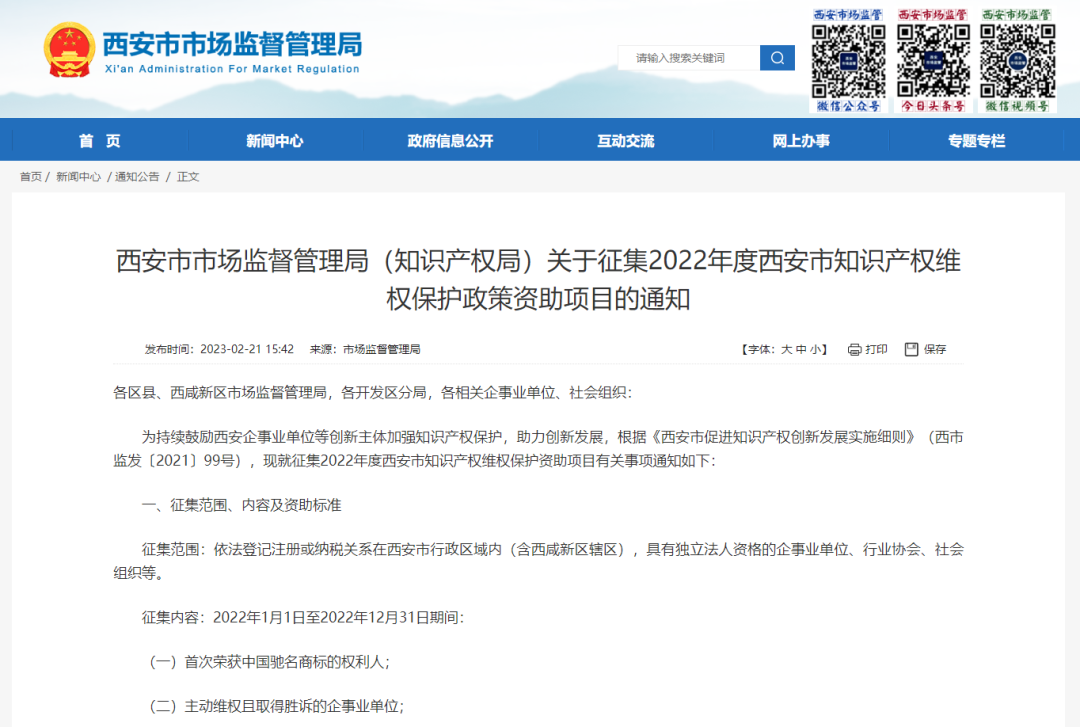 西安市市场监督管理局(知识产权局)丨关于征集2022年度西安市知识产权维权保护政策资助项目的通知