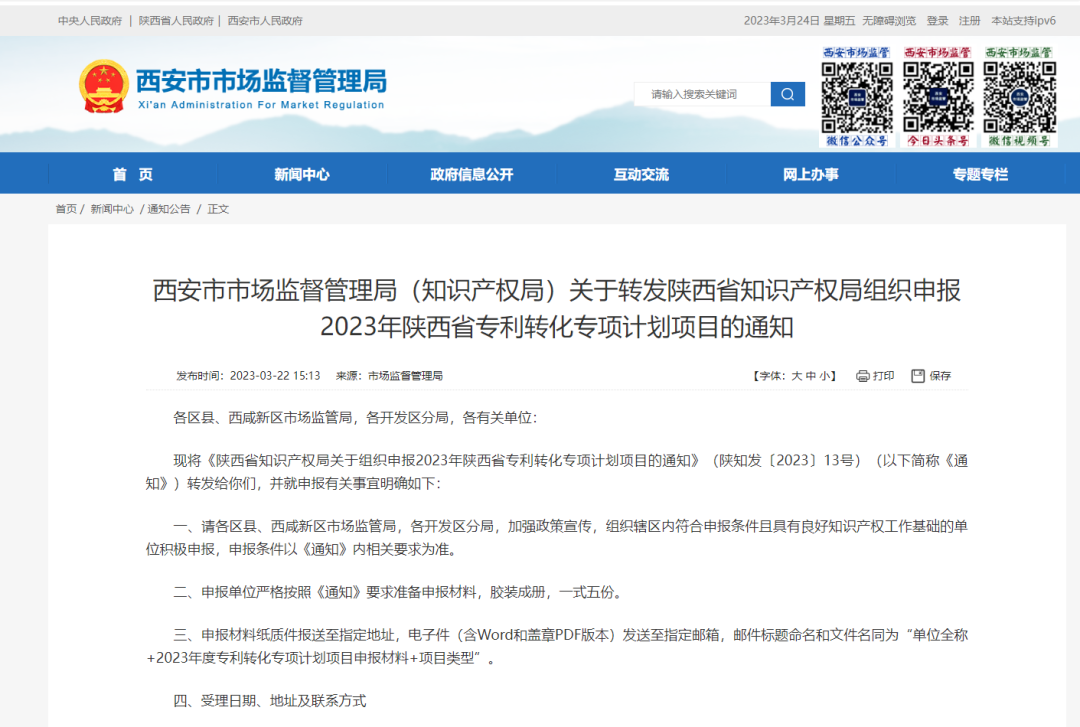 点击链接:陕西省知识产权局丨关于组织申报2023年陕西省专利转化专项计划项目的通知